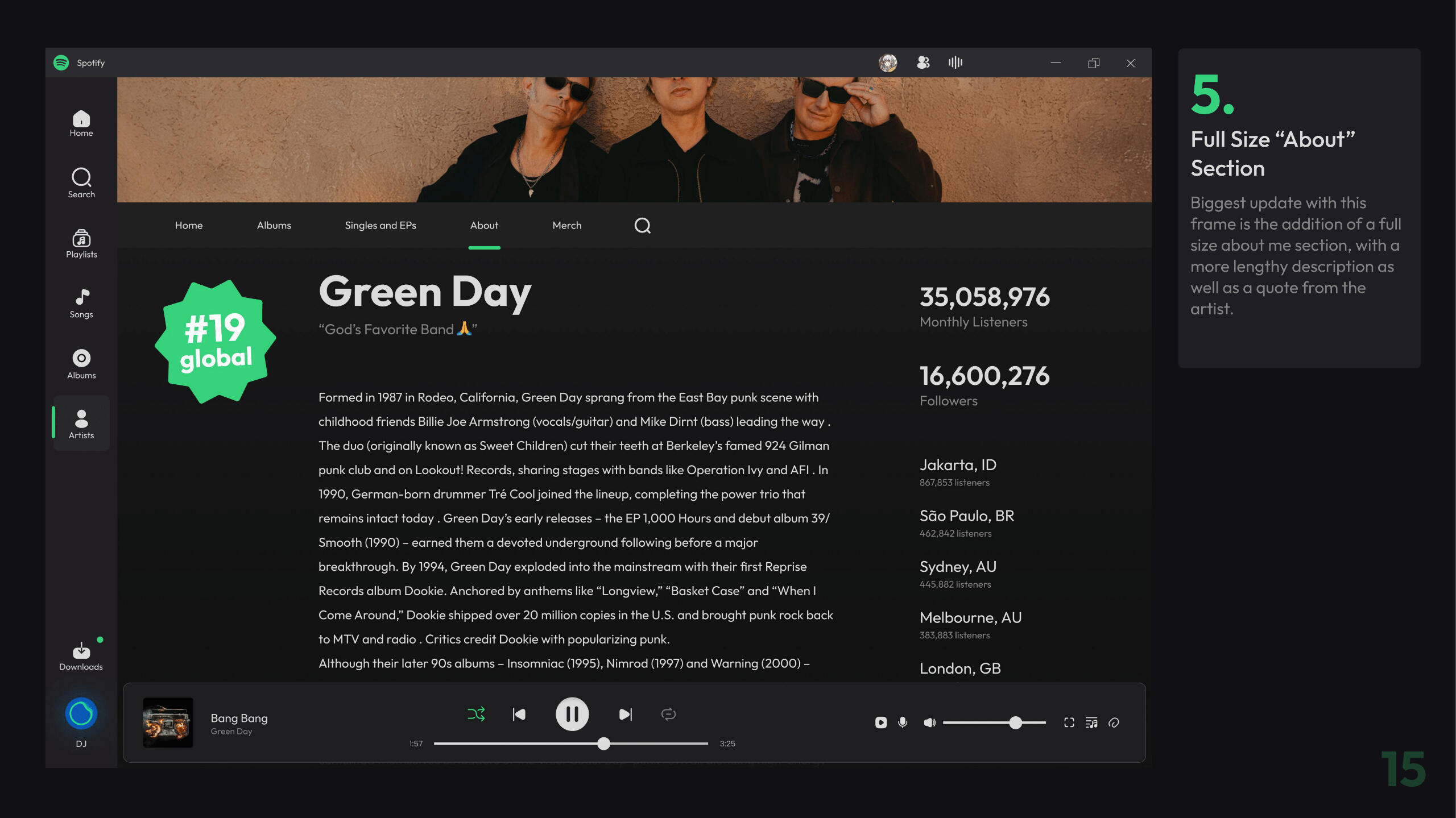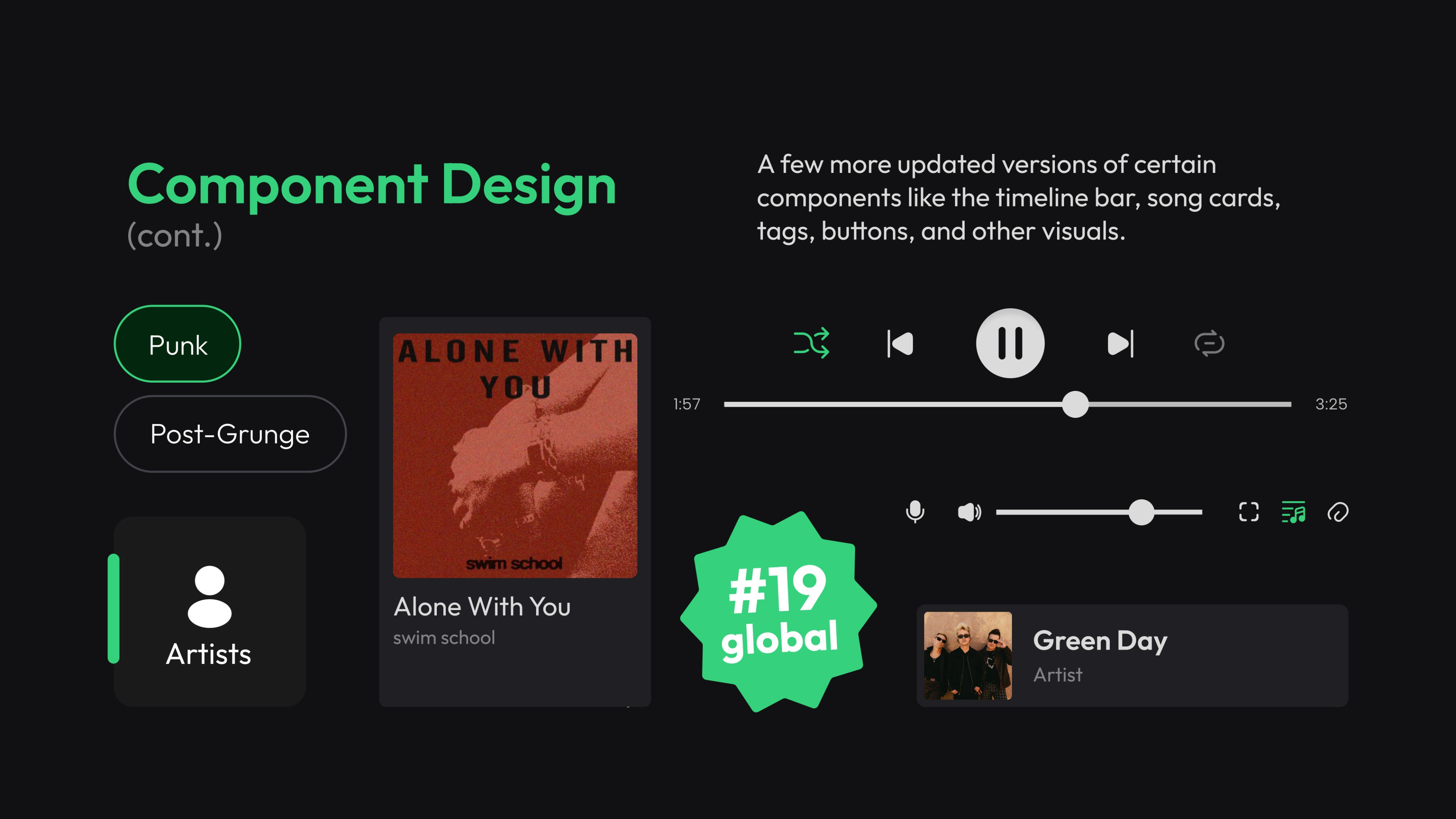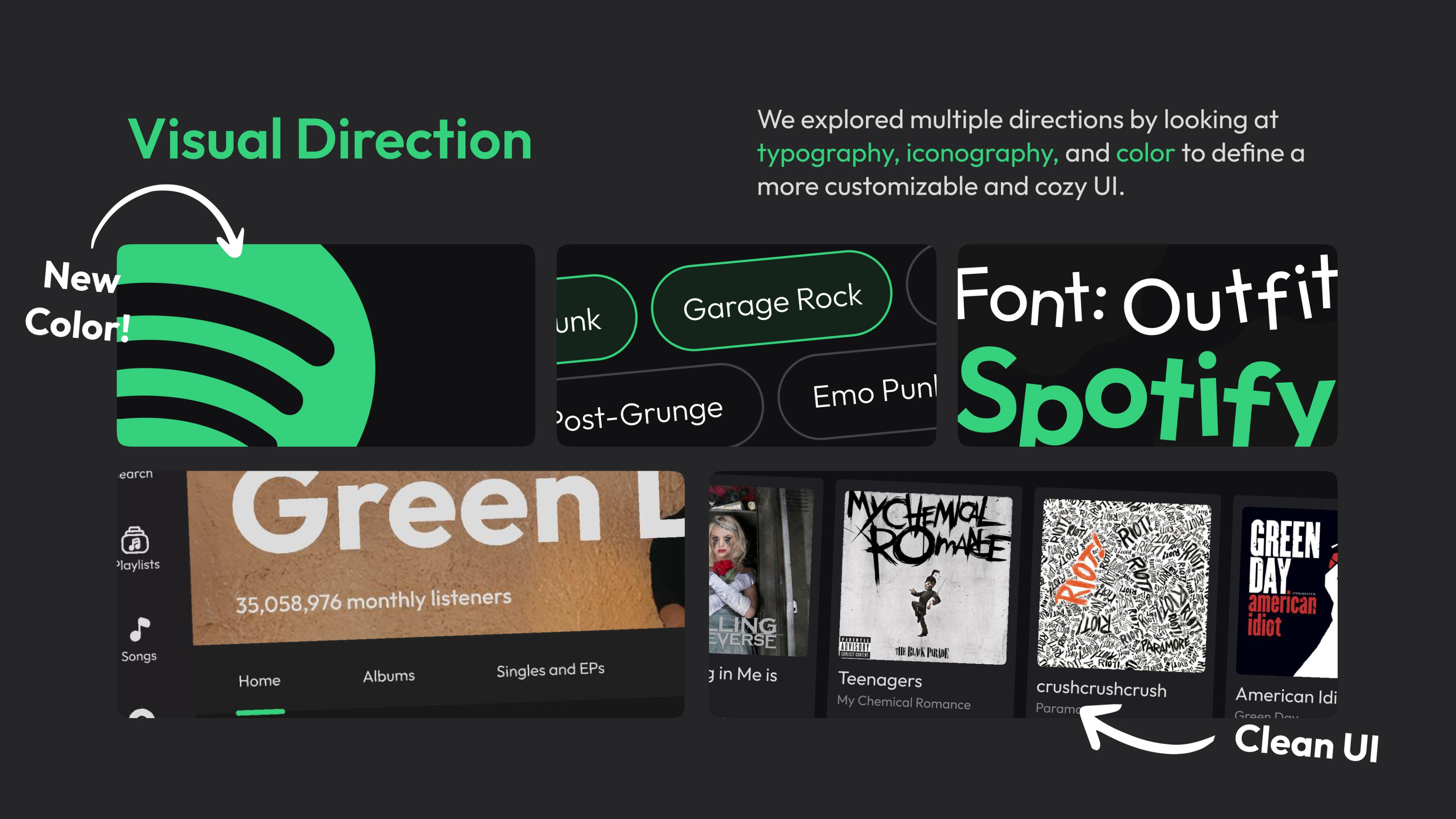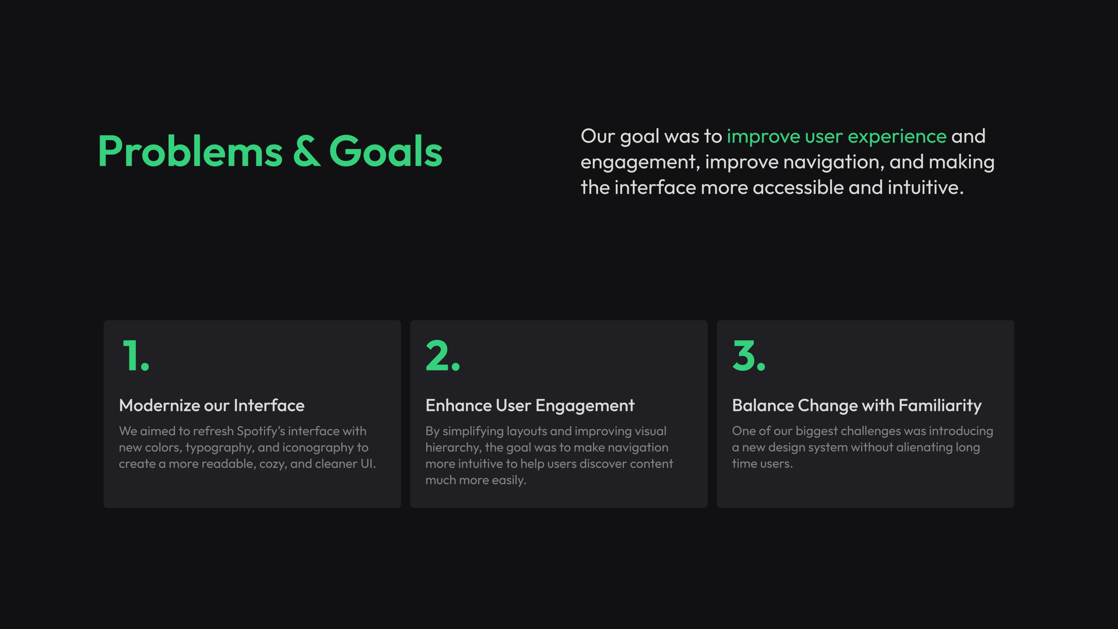 To create a refresh for the desktop version of Spotify that refines its visual identity through an updated color palette, fonts, and a new UI layout.