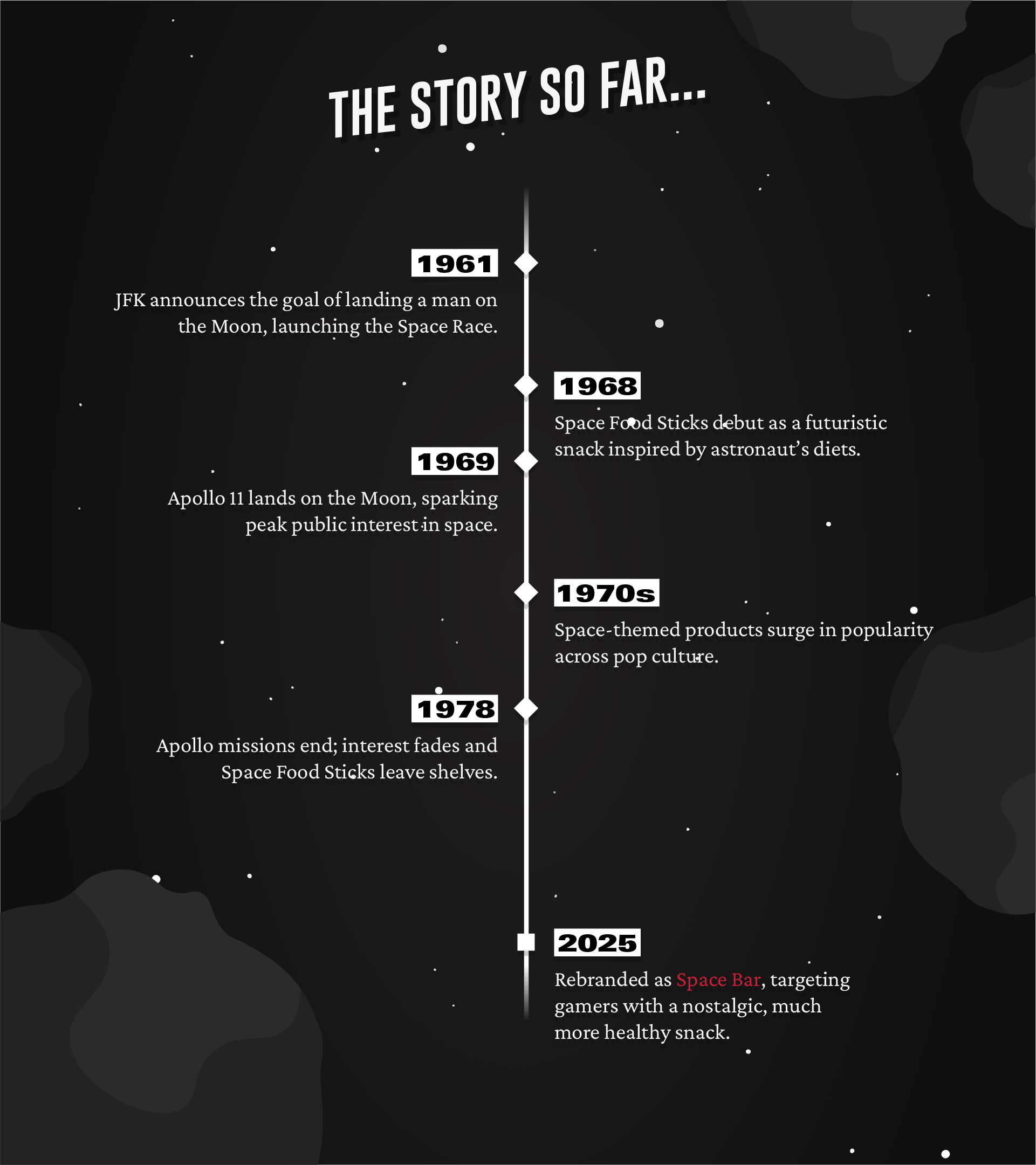 To create a complete overhaul of a discontinued product of our choice. I chose to remix "Space Sticks" and market it toward gamers wanting to eat healthier.