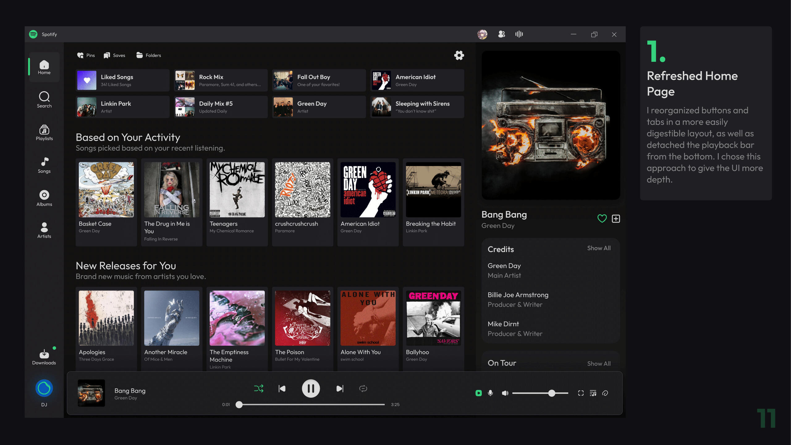 To create a refresh for the desktop version of Spotify that refines its visual identity through an updated color palette, fonts, and a new UI layout.